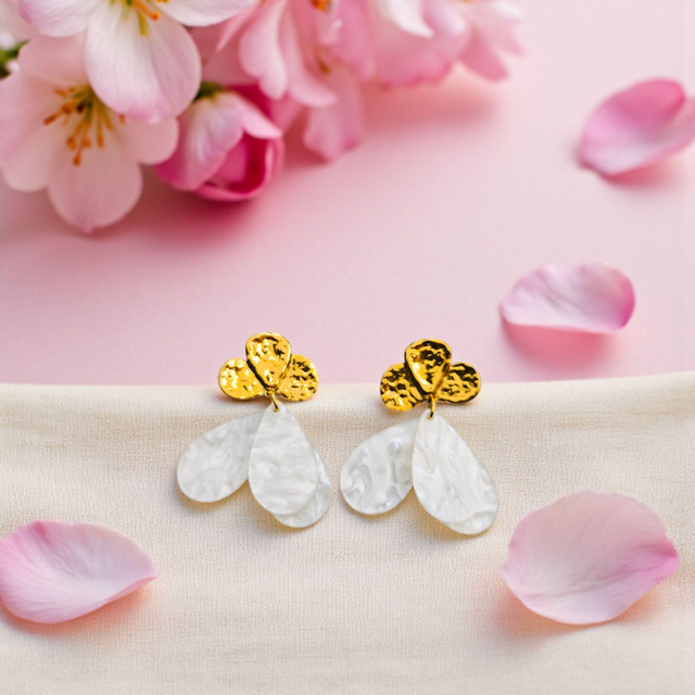 Boucles d'oreilles doré en résine et acier inoxydable un matériel qui résiste à l'eau, garantis sans nickel sans cadmium et sans sel de plomb, longueur totale 7,5 cm largeur 2,2 cm
