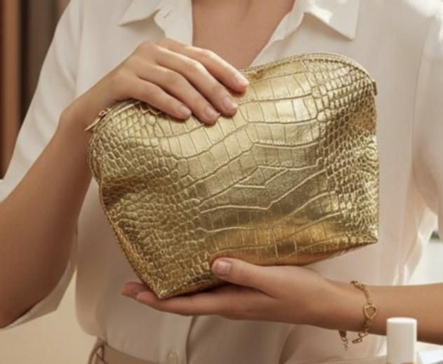 Pochette dorée effet crocodile tendance, longueur 23 cm hauteur 17 cm profondeur 6 cm. Avec fermeture à glissière modèle fashion. ✨
